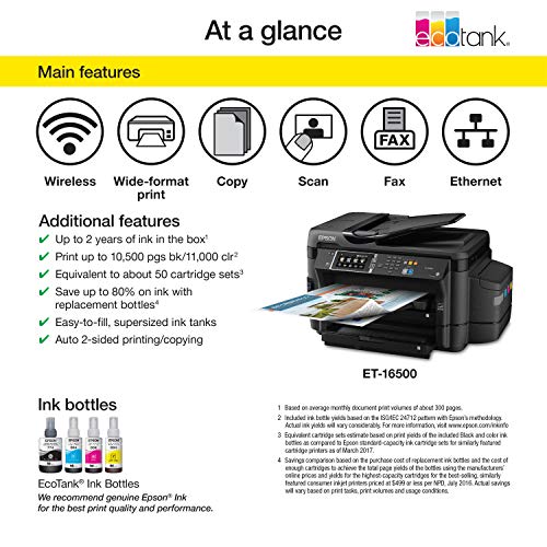 - Save up to 80 percent on ink with low-cost replacement bottles - features easy-to-fill supersized ink tanks.